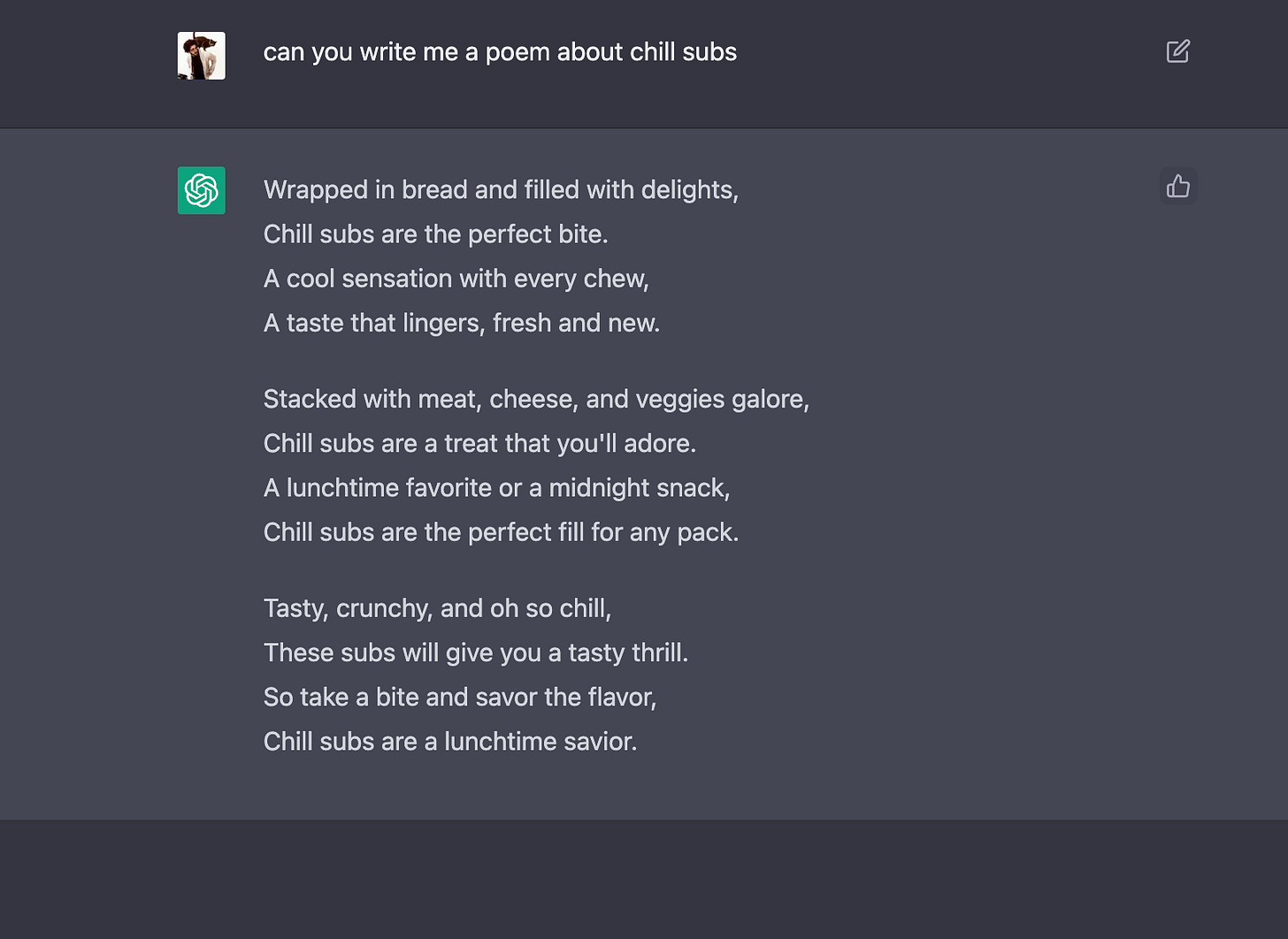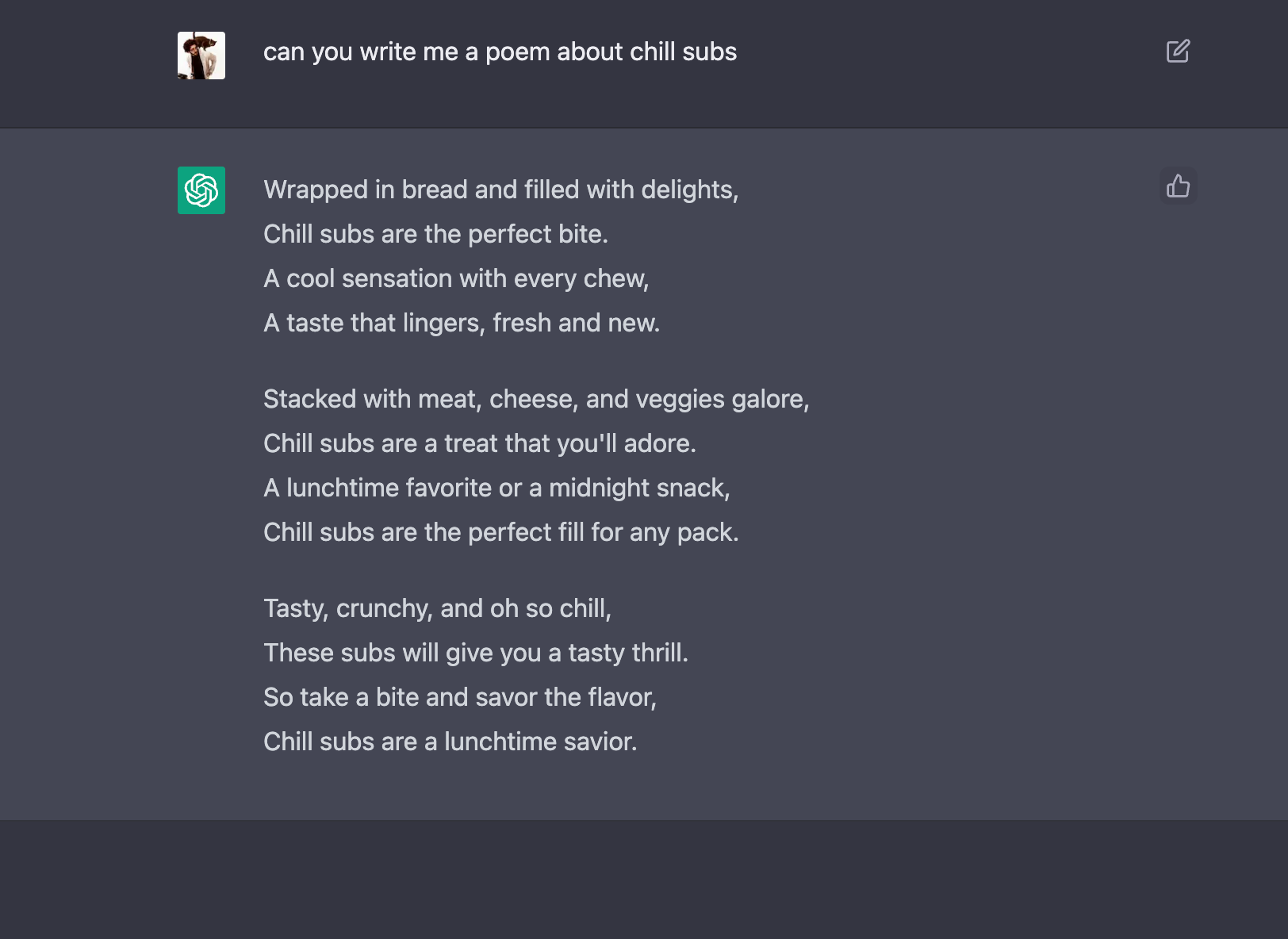 So instead of making solid business connections to help us grow & flourish, I went and asked Chat GPT3 (or whatever) to write me a poem about Chill Subs: