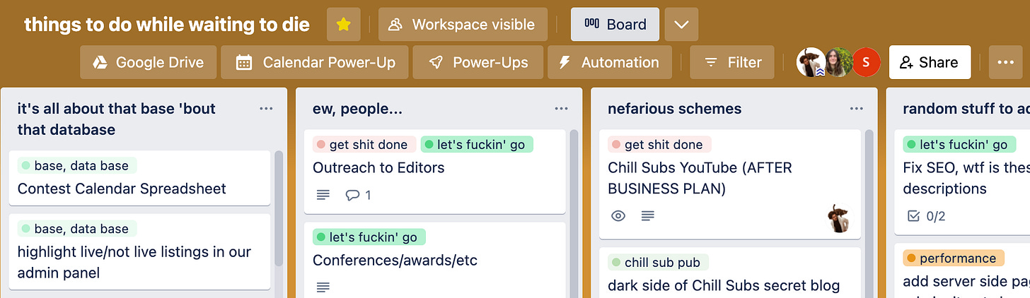 We'll do this here each month rather than over-stuff our regular newsletter. The logic is: if you like us enough to read ‘Things We Do While Waiting to Die’, you’re likely curious about what heck we do all the time.
